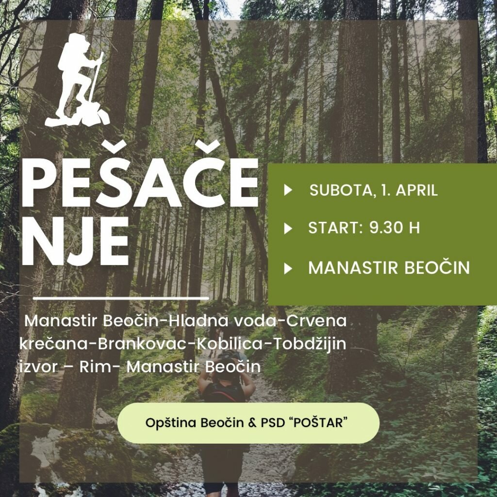Opština Beočin i PSD „Poštar” vas pozivaju na prvo rekreativno pešačenje ovog proleća koje će se održati u subotu, 1. aprila sa početkom u 9.30 časova.